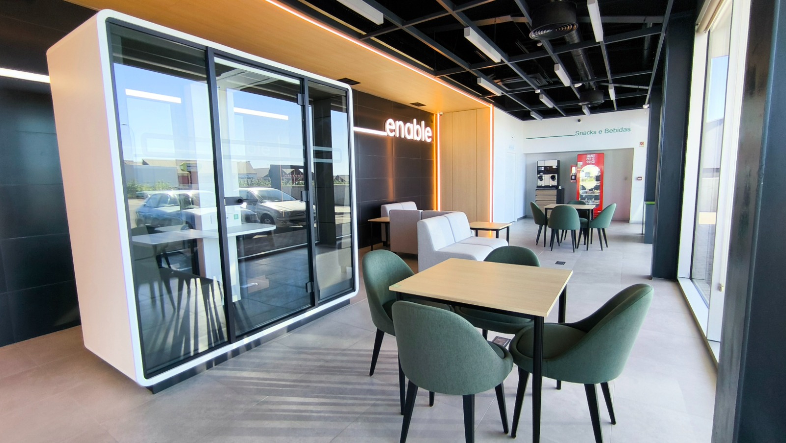 O Hub de Carregamento da Enable Mobility da Abrunheira disponibiliza 18 lugares de carregamento rápido e ultrarrápido e um lounge de acesso exclusivo, concebido para que os utilizadores possam trabalhar ou descansar durante o carregamento num ambiente confortável, com acesso a cabine de reuniões, máquinas de vending e num espaço totalmente diferenciador.